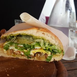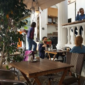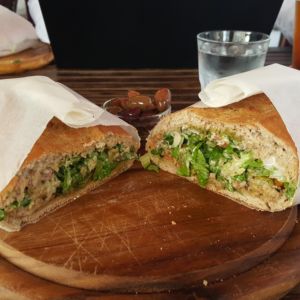 Auf der Suche nach einem Café für eine kurze Pause am Sonntag Nachmittag, fanden wir das Beit Ha’Amudim mit seiner einladenen Terrasse. Wir bestellten zwei Bier und da die Küche nicht komplett auf hatte entschieden wir uns für das vegane Sandwich mit Gemüse und das Sandwich mit Spiegelei und Käse.