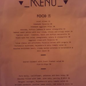Auf der Speisekarte finden sich allerlei eher kleine Gerichte, pro Gast kann man also ruhig zwei auswählen. Es gibt Dips wie Hummus oder Baba Ghanoush, selbst gebackenes Focaccia, Salate, Fleisch, Fisch und dazu auch immer noch Tagesangebote. Die Happyhour ist von 17:30 – 20:00. Zu der Zeit bekommt man zwei Bier zum Preis von einem.