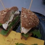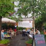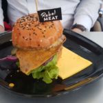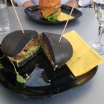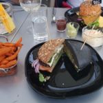 Wir besuchten das Lokal an einem Freitag Abend gegen 20:00 und hatten vorab einen Tisch draußen reserviert. Wir bestellten ein Bier und unterschiedliche Weißweine (wobei wir am Ende alle auf Muskateller umgestiegen sind). Meine Freundin und ich entschiedenen uns, den veganen und vegetarischen Burger zu teilen: Die Griechin kommt mit Zucchini, Aubergine und Schafskäse in einem Kürbis-Brötchen. Der Burger Falafel mit einem Falafelpatty und in einem schwarzen Brötchen. Dazu teilten wir uns eine Portion Süßkartoffelpommes. Die Junges bekamen den Rebel Meat Burger: ein Patty aus Bio-Rindfleisch, Bio-Kräuterseitlinge und Bio-Hirse.