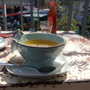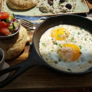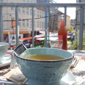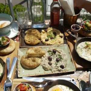 Wir sind an einem Samstag Mittag gegen 13 Uhr zum Frühstücken hergekommen und bekamen einen Tisch oben auf der Terasse mit Blick auf den bunten Wochenmarkt. Wir bestellten Cafe, Tee und Saftschorle und entschieden uns zum Frühstück jeweils für das libanesische Frühstück (Spiegelei mit Tahini, Oliven, Gurken-Tomaten-Salat und selbstgemachtes Pitabrot).