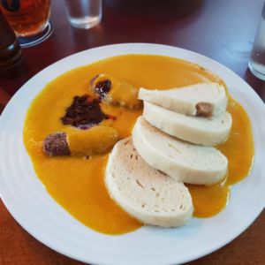 Danach gab es für mich das Svíčková mit Knödeln. Svíčková ist ein traditionell böhmisches Gericht, was normalerweise mit Rinderfilet und Sahnesoße zubereitet wird. Hier ist es vegan interpretiert: Statt Fleisch gibt es Gemüsepatties aus schwarzen Bohnen, in einer Kürbis-Soße und böhmische Semmel-Knödel.