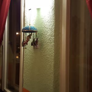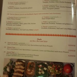 Wir besuchten das Restaurant an einem Sonntag Abend gegen 18 Uhr ohne Reservierung. Die Tische im vorderen – und hübscheren – Bereich waren schon besetzt. Wir bekamen aber noch einen Tisch im hinteren Bereich. Wir bestellten erst einmal ein Weizen und einen Chai. Wenn man sich – wie ich – nicht gut entscheiden kann und am Liebsten alle Currys probieren möchte, ist das Gericht Thalis wunderbar: Dabei können drei Curry-Gerichte kombiniert werden (rein vegetarisch, gemischt oder rein mit Fleisch).