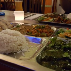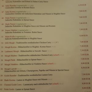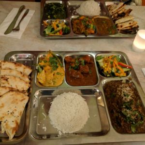 Wir bestellten ein rein vegetarisches mit Shahi Dal Masala (Linsen), Palak Panner (Rahmkäse mit Spinat) und Sabi Rasedar (Gemüse in Kasara-Sauce) und ein gemischtes mit Sabji Korma (Gemüse), Murgh Palak (Hühnchen in Spinat-Sauce) und Chennai Gosht Curry (Lamm) . Die Currys werden mit einem kleinen Salat, Reis und Naan-Brot serviert.