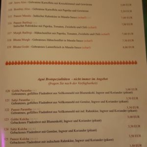 Fazit: Umfangreiches Menu, große Portionen. Ich war zwar noch nie in Indien, aber angeblich ist das Essen im Agni sehr authentisch.