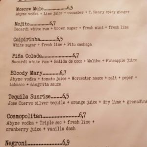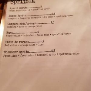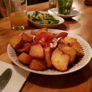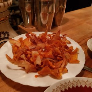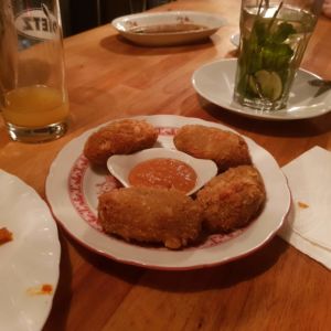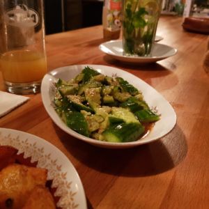 Wir besuchten das Restaurant an einem Dienstag Abend gegen 20 Uhr und bekamen ohne Reservierung einen Platz nur noch einen Platz an der Bar. Wir bestellten ein Glas Weißwein und einen Tee. Wir gingen die Karte durch und bestellten Patatas Bravas, Sichuan Gurkensalat, Süßkartoffel- und Yuccachips, Croquetas und (veganen) Lachs mit Frischkäse.