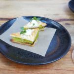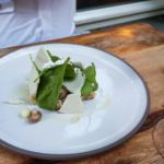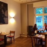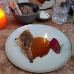 Der erste Gang basierte ebenfalls auf Topinambur – auf Gazpachosud und mit Sauerampfereis. Danach bekamen wir Spargel mit Morchel auf Sauce Gribiche und Bärlauchpesto. Zum dritten Gang Kohlrabi und Lauch in verschiedenen Formen mit Eigelb und Buchweizen.Den vierten Gang bekam nur meine Begleitung: Es gab pürierte Artischoke mit Spinat und Fourme d’Ambert – einer französischen Edelschimmelkäsesorte. Zuletzt aßen wir Spitzkohl auf Gemüsesud und rote Beete-Mus.