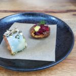 Zu Beginn, gab es gleich 2 Grüße aus der Küche: geräuchertes Erbsenpüree auf Toast und rote Beete in einer gebackenen Topinambur.