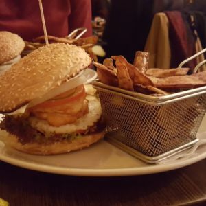 Wir besuchten das Restaurant mit einer Reservierung an einem Donnerstag Abend gegen 19 Uhr. Das kleine Lokal mit circa fünf Tischen war voll. Wir bestellten zuerst einen Tee und ein Bier. Meine Begleitung bestellte einen einfachen Cheeseburger und ich auf Empfehlung des Kellers den Halloumi-Burger mit Spiegelei und getrockneten Tomaten. Dazu Kartoffelschalen, Mayonaise und Guacamole.