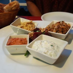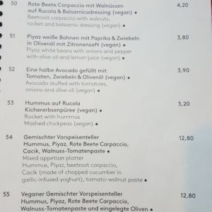 Wir besuchten das Restaurant an einem Mittwoch Abend gegen 20 Uhr und bekamen ohne Reservierung einen Platz an einem der Tische auf der Terrasse. Wir bestellten erst ein mal je ein Glas Weinschorle und eine Apfelschorle. Wir entschieden uns für den vegetarischen Vorspeiseteller vorab zum Teilen.