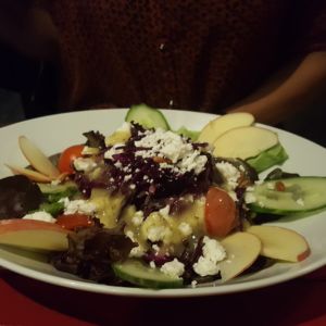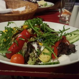 Zusätzlich entschieden wir uns für den Salat mit gegrilltem Gemüse und den mit Rotkohl und Äpfeln. Zum Vorspeisenteller kam dann auch das angekündigte Knoblauch/Tomaten-Fladenbrot.