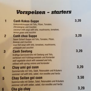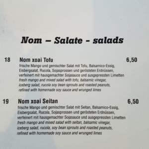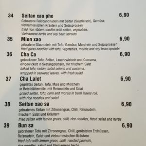 Wir besuchten das Restaurant an einem Mittwoch Abend gegen 18:30Uhr und bekamen ohne Reservierung einen Platz. Im Verlaufe des Abends wurde es noch voller. Wir bestellten Getränke und zum Essen entschied ich mich für die Vorspeise Ha cao chay (Teigtaschen mit Tofu und Gemüse) und einen Nom xoai Tofu (ohne Mango) – ein Salat mit Tofu.
