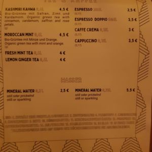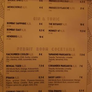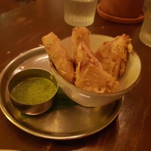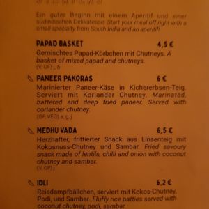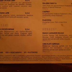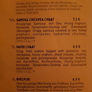 Wir besuchten das Restaurant an einem Montag Abend gegen 21 Uhr Uhr mit einer Tischreservierung. Das Menü ist für indische Restaurant relativ übersichtlich – aber keinesfalls weniger kreativ. Wir bestellten eine Flasche Weißwein und zur Vorspeise die Paneer Pakoras (Paneer-Käse mit Koriander Chutney) und Samosa Chickpea Chaat (Samosa mit Honig-Joghurt, Kichererbsen und Granatapfel).