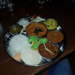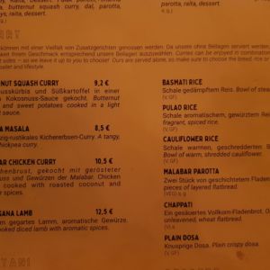 Des Weiteren entschieden wir uns dann für drei verschiedenen Thalis: einmal das vegane (Butternussürbis Curry, Cahnna Masala, Sambar-Linsen), einmal das vegetarische (Paneer-Spinat Curry, Channa Masala, Butternusskürbis, Dal-Linsen) und einmal das Thali mit Hühnchencurry.