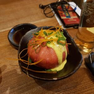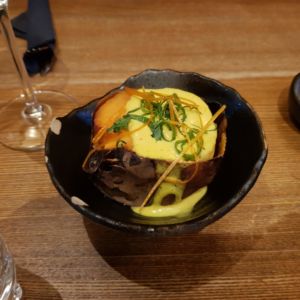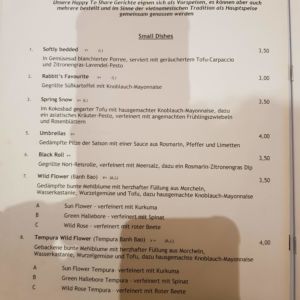 Wir bestellten ein Bier und einen Weißwein und vorab zum Teilen einmal Rabbit’s Favourite (gegrillte Süßkartoffeln mit Knoblauch-Mayonaise) und die Wild Flower Banh Bao (gedämpfte bunte Mehlblume). Als Hauptspeise entschied ich mit für das Gericht Happy Monk – ein in einer heißen Steinschale serviertes Reisegericht mit geräuchertem Seitan, Tofu, Wurzelgemüse und Spinat. Meine Begleitung bekam Hot Rabbit – ebenfalls ein Com Tam-Gericht mit gegrillter Aubergine, Tofu-Quiche, Wurzelgemüse und Spinat.
