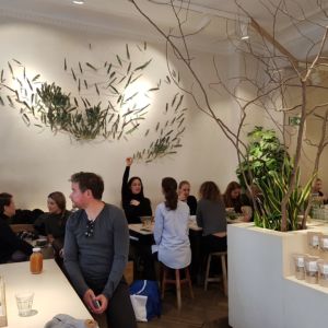 Wir waren an einem Samstag Mittag gegen 13 Uhr im Daluma. Wir bestellten am Tresen und saßen uns mit an einen der großen Tische. Das Essen hat ein bisschen gedauert, da alles frisch zubereitet wird. Für uns gab’s jeweils die ORIENTAL STUDY Bowl: Blumenkohl, Quinoa, Hummus mit Granatapfel, Minze, Römer-Salat und mehr.