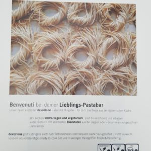 Das Restaurant Devozione ist eine vegetarische Pasta Bar in Friedrichshain in der Nähe des Boxhagener Platz. Erst Mitte Mai 2020 eröffnet, bietet das Restaurant vor allem frische, hausgemachte Pasta, aber auch Foccacia, Antipasti und Risotto. Traditionelle italienische Gerichte sind vegetarisch neu interpretiert. Alles wird mit biologischen und frischen Zutaten zubereitet – und mit Devozione, also mit Hingabe. Zusätzlich zum Restaurantbetrieb bietet das Devozione auch Kochboxen zum Mitnehmen und zuhause Kochen.