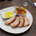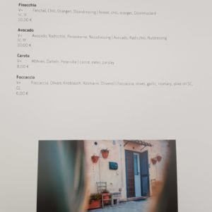 Wir besuchten das Restaurant an einem Mittwoch Abend gegen 19:00 Uhr. Wir setzten uns in den ruhigen Innenhof und stöberten erst einmal durch die Karte. Neben Wasser und einem Glas Rotwein bekamen wir zu Beginn einen Gruß aus der Küche: italienischer Kartoffelsalat, selbstgebackenes Ciabottabrot und dazu Olivenöl. Zur Vorspeise teilten wir uns das Finocchio (Fenchel, Chili, Organgen mit Dijondressing).