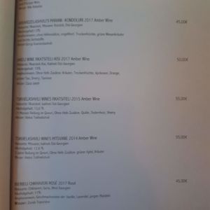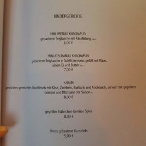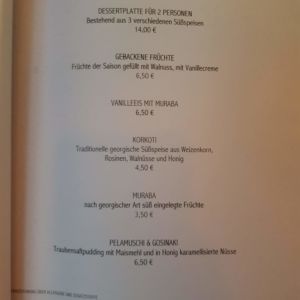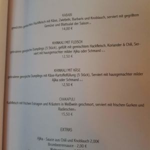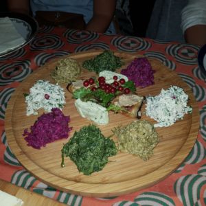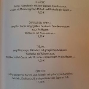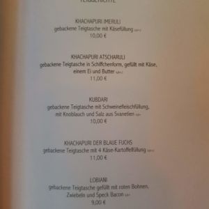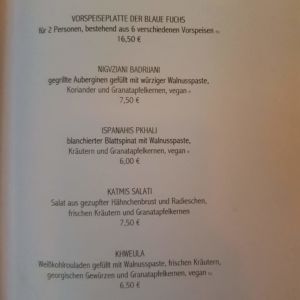 Wir besuchten das Restaurant mit einer Tisch-Reservierung an einem Samstag Abend gegen 20:00 Uhr und konnten draußen an einem Tisch Platz nehmen. Nach ausführlichem Stöbern durch die Speisekarte entschieden wir uns vorab für die Vorspeisenplatten und das Mchadi da Kveli – ein Maismehlgebäck mit Schafskäse und Tomaten. Auf der Vorspeisenplatte gab es die Rote-Bete-Paste, Blattspinat mit Walnusspaste, eine Paste aus Hähnchenbrust und Radieschen, Mozarella-Röllchen, gegrillte Aubergine und Weißkohlrouladen gefüllt mit Walnusspaste.