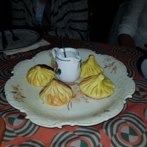 Zur Hauptspeise bekamen wir neben einem Gericht namens Ojakhuri (Schwein mit Kartoffeln) und gebratene georgische Dumplings (Khinkali) mit Käse-Kartoffelfüllung.
