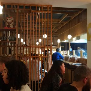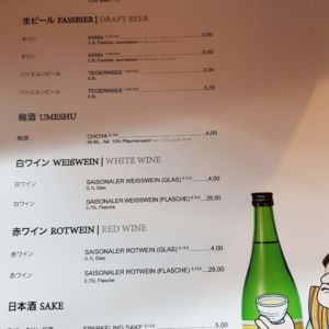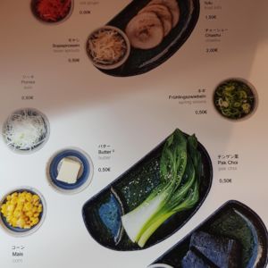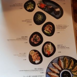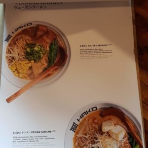 Wir besuchten das Restaurant an einem Mittwoch Abend gegen 19:30Uhr und bekamen ohne Reservierung einen Platz in dem gut besuchten Restaurant. Wir bestellten ein Glas Weißwein und ein japanisches Bier. Vorab teilten wir uns eine Portion vegetarische Gyoza und als Hauptspeise bekam ich das Vegan Miso (Gemüsebrhe, Miso-Basis, vegane Nudeln, Bambus, Pak Chaoi, Mais, Sojasprossen und veganer Schweinebauch) und meine Begleitung das Vegan Tantan (mit Sojafleisch und frittiertem Tofu). Bei letzterem wird Sesampaste in die Brühe hinzugefügt, wodruch diese cremig wird.