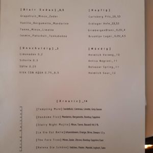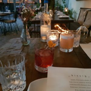 Wir besuchten das Restaurant mit Reservierung an einem Montag Abend gegen 19:30. Wir bekamen einen Tisch draußen auf der Außenterasse. Wir entschieden uns vorab für einen Heimlich Sour, einen Antica Negroni und eine Flasche Sprudelwasser. Zum Essen tranken wir Weißwein.