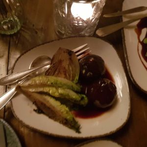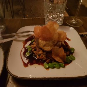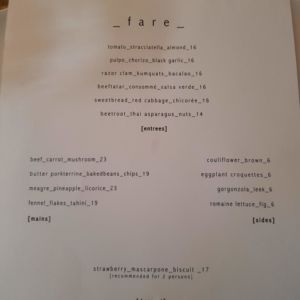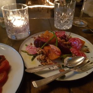 Als Vorspeise teilten wir uns die beiden vegetarischen Optionen: Tomate-Stracciatella-Mandel und Beete-Thaispargel-Nüsse. Zum Hauptgang bekam meine Begleitung die Sau mit Bohnen und selbstgemachten Kartoffelchips und wir bestellten alle Beilagen: Blumenkohl, Auberginen Kroketten, Gorgonzola-Lauch-Suppe und Romana-Herzen mit Feigen. Die Auberginen Kroketten waren mein Favorit.