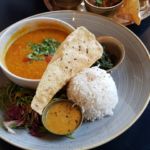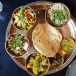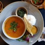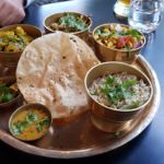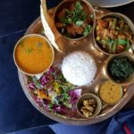Wir besuchten das Restaurant an einem Donnerstag Abend um 19:30 und hatten vorab einen Tisch draußen reserviert. Wir bestellten Wasser, ein Weizen, einen Nepali Milk Tee und zur Vorpeise das Newari Kahja Set Vegan – eine Zusammenstellung verschiedener veganer Snacks (ein Beluga-Linsen-Patty, Reisflocken, Kartoffelsalat, Rettich, geröstete Sojabohnen und geröstete Erdnüsse). Danach bekam ich das Dal Bhat: Linsensuppe mit Reis, gedünstetem Spinat, Papadam und Salat. Meine Begleitung entschied sich für das Hähnchencurry Kukhura Thali.