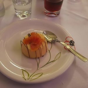 Zum Abschluss gab es noch eine süße Nachspeise: Orangentartelette. Zum Cafe und Digestif bat uns der Kellner an die Bar.