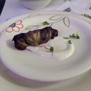 Erst gab es einen mit Zwiebeln, Pecorino und Pinienkernen gefüllten Pilz, eine Radiccioroulade mit wildem Brokkoli und Ricottasauce, ein Spinattörtchen mit Mangold und Bechamelsauce,