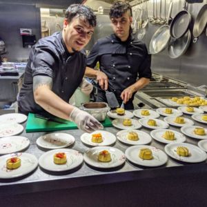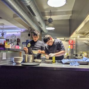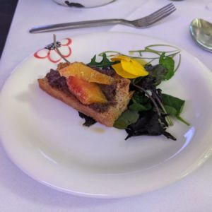 Mittags gibt es eine kleine, täglich wechselnde Karte. Am Abend wird ausschließlich ein gesetztes 9 Gänge Menü serviert – alle Gäste bekommen zur gleichen Zeit das gleiche Essen. Natürlich gibt es auch jeweils eine vegetarische Variante.