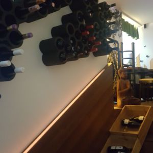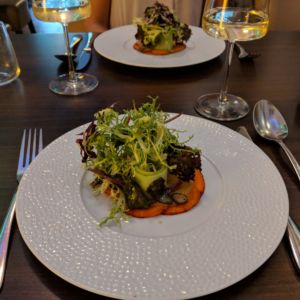 Wir besuchten das Restaurant ohne Reservierung an einem Sonntag Abend gegen 20:00. Wir bekamen zunächst nur drinnen einen Tisch – nach dem Gruß aus der Küche konnten wir jedoch nach draußen umziehen. Wir entschieden uns für das 5-Gänge-Menü (mit der Käseplatte als Nachspeise) mit Weinbegleitung.