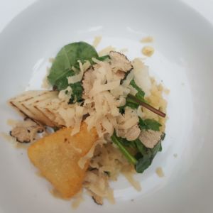 Zur Zwischenspeise gab es Sellerie-Risotto mit Sellerie-Schnitzler, Sommertrüffel, jungem Spinat und Maisrübchen.