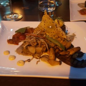 Der Hauptgang bestand aus gegrilltem Portobello, Topinamburgratin mit gefüllter Zucchini, Rettich-Ravioli und Aprikosensalsa.