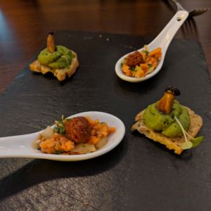 Vorab gab es einen Gruß aus der Küche (Süßkartoffelsalat, Quinoa-Bällchen, Erbsen-Bohnen-Püree)