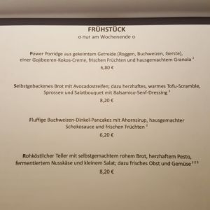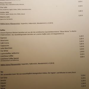 Auf der Speisekarte sind gesunde, kreative Kombinationen zu finden – von Suppen und Salaten bis hin zu Burgern und Pasta. Ein täglich wechselndes Gericht wird an der Tafel angeboten. In der Vetrine laden vegane Kuchen zum Nachtisch oder Kaffee ein. Am Wochenende gibt es Frühstück a la carte und jeden zweiten und vierten Samstag im Monat ein Plant-Based Brunch-Buffet zwischen 11:00 und 15:00 Uhr. Das Buffet kostet 14,50€ pro Person und es wird um Reservierung gebeten.