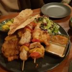 Wir besuchten das Restaurant an einem Montag abend gegen 18:30 und bekamen noch einen Platz an den niedrigen Tischen. Wir bestellten zwei Weinschorlen und vorab den veganen Vorspeisenteller. Zum Hauptgang teilten wir uns das vegetarische Thali: Gemüse-Curry, Blatspinat, Daal, Kartoffelsalat und Erdnusssauce mit Papad und Reis.