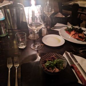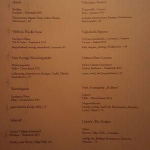 Das Mittenmang ist eins unserer Lieblingsrestaurants in unserem Kiez. Zuletzt besuchten wir das Restaurant an einem Dienstag Abend gegen 19 Uhr und bekamen ohne Reservierung einen Platz an einem der kleinen Tische im vorderen Bereich des Restaurants. Wir bestellten zunächst eine Flasche Scheurebe und ein Mineralwasser.