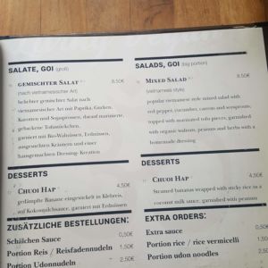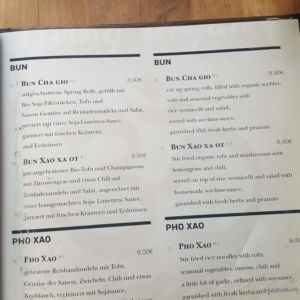 Zum Hauptgang entschieden wir uns für ein Com Cary (ein Kokus-Curry mit Tofu, Gemüse und Reis) und ein Bun Xao Xa Ot (Reisfadennudeln mit Tofu, Gemüse, Salat und Zitronengras). Das Essen kam zügig, war schön angerichtet und die Bedienung sehr freundlich.