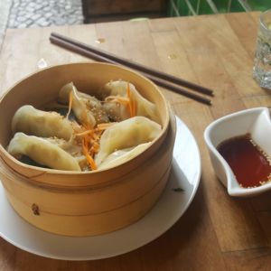 Wir besuchten das Restaurant an einem Mittwoch Abend gegen 18:30Uhr und bekamen ohne Reservierung einen Platz an einem der wenigen, kleinen Tische auf dem Bürgersteig. Wir bestellten Wasser, ein Glas Weißwein und hausgemachte rote Limonade aus Himbeeren. Zur Vorspeise teilten wir uns Dim Sum.