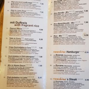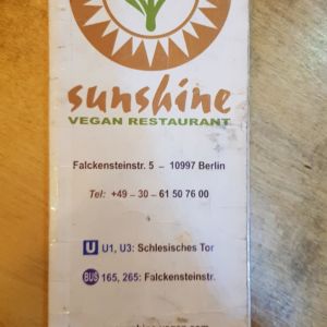 Das Sunshine ist ein veganes, vietnamesische Restaurant in Berlin Kreuzberg – in der Nähe vom Schlesischen Tor. Auf der Speisekarte findet man kreative, vietnamesische Gerichte, die alle vegan zubereitet werden. Es wird mit Fleischersatz gekocht: Rind-, Hühner-, Fisch- und Enten-Imitat. Es gibt Vorspeisen wie Suppen, Salate oder Sommerrollen und als Hauptgerichte verschiedene Nudelsuppen, Reisgerichte und Nudelsalate. Wie der Name schon sagt, geht es hier um Fröhlichkeit. Dies spiegelt die helle Inneneinrichtung wider: Buddha Wandgemälde, gemütliche Holzstrukturen, sowie Pflanzen sorgen – neben dem auf pflanzlichen Produkten basierten Menü – für Naturverbundenheit.