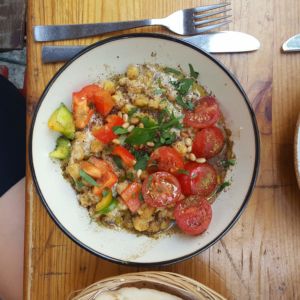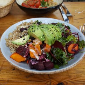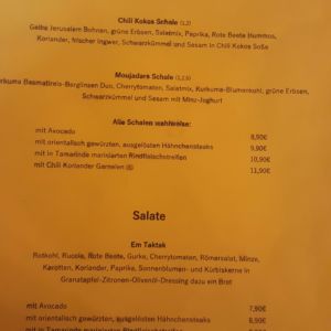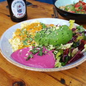 Wir bestellten: Die Grün Beete Schale mit Avocado, die Chili Kokos Schale ebenfalls mit Avocado und Balila Hummos bunt (ganze gekochte Kichererbsen mit Tomaten und Paprika).