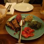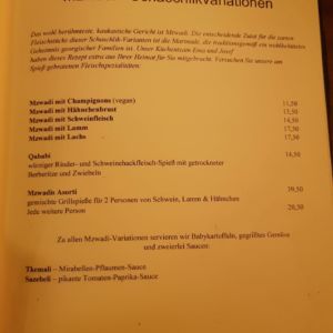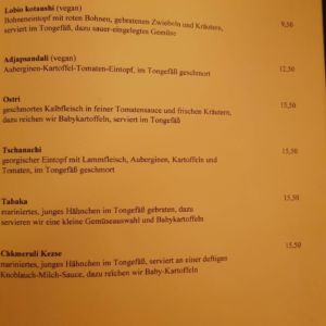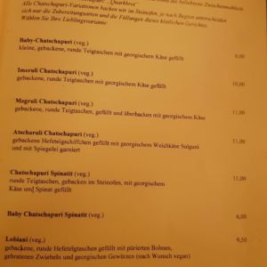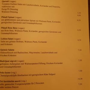 Wir besuchten das Restaurant an einem Montag Abend gegen 18:30 und bekamen ohne Reservierung einen der wenigen freien Tische. Wir bestellten die gemischte Vorspeisenplatte: Spinat mit Walnuss-Paste, Rote-Bete-Walnuss-Paste, gebratene Aubergine mit Walnusspasten-Füllung, gefüllte Paprika – serviert mit Brot. Dazu noch die Baby Chatschapuri Spinatti und den Auberginen-Kartoffel-Tomaten-Eintopf.