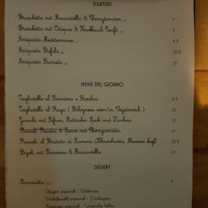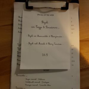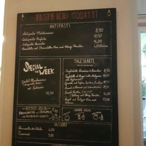 Für das aktuelle Menu, hier zur Webseite von la Pastificio Tossati oder zu Facebook.