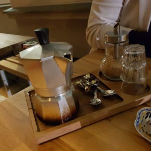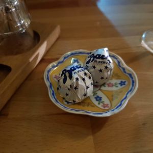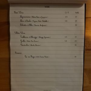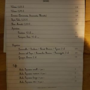 Wir besuchten das Restaurant an einem Mittwoch Abend gegen 19:30 und haben uns draußen an einen kleinen Tisch gedeckt. Das Lokal ist im Inneren sehr klein mit Sitzplätzen für schätzungsweise lediglich 10 Personen. Wir bestellten Wasser, ein Glas Wein und die Bigoli mit Pomodora & Stracciatella. Bigoli ist eine etwas härte und dickere Spaghetti-Art, zubereitet mit frischer Tomatensoße, Basilikum und einem Mozarella-ähnlichem Käse. Danach gab’s noch zwei Espressi. Leider war das Tiramisu alle – dafür gab uns Tossati aber eine Kugel Schokolade.