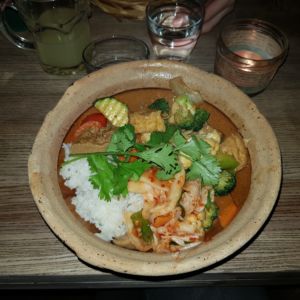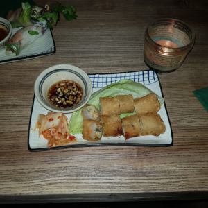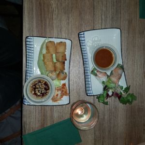 Wir entschieden uns vorab für die Buddha Rolls (und Sommerrollen mit Ganelen). Als Hauptspeise bekam ich die Shaolin Bowl (Seitan, Tofu und Gemüse in Satésoße).