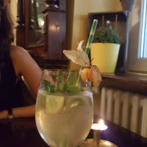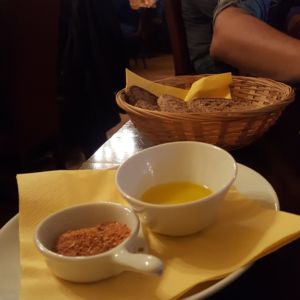 Wir besuchten das Restaurant mit Reservierung an einem Donnerstag Abend gegen 19:00. Vorweg bestellten wir einen Hugo und ein Glas Weißwein. Zur Vorspeise bestellten wir den Antipastateller (Oliven, getrocknete Tomaten, Kräutersojaquark, Mixed Picles und Kräuterbutter). Dazu wurde ein Bio-Treberbrot mit Rapskernöl und hausgemachter Gewürzsalzmischung gereicht. Übrigens: Der Treberbrotteig besteht aus dem in der Bierherstellung übrig gebliebenen Gertenmalzschrot.