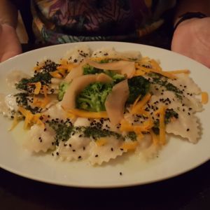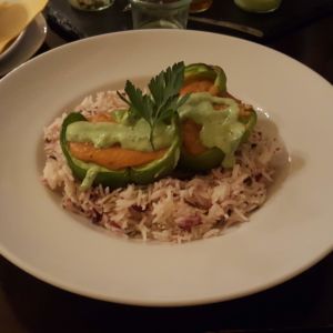 Zur Hauptspeise bekam ich gefüllte Paprika auf Reis (Tagesangebot), meine Begleitung Halbmondpasta mit Brokkoli und Melonen.