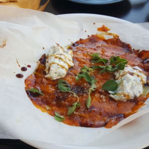 Der Teller Aviv besteht aus den Dips Tahina mit Arisa, Matbucha und ein Joghurtdip mit Dattelhonig und wird mit Brot und Oliven serviert. Zum Blumenkohl gabs Tahina und zu der pürierten Süßkartoffel Tzaziki und grobe Meeressalzkörner.