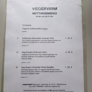 Das VEGEFARM Restaurant ist ein taiwanesisches Restaurant mit ausschließlich veganen und vegetarischen Speisen in Peterswerder, in Bremen. Das VEGE des Namens bezieht sich auf vegan bzw. vegetarisch, das FARM steht für den aus Soya und anderen Zutaten hergestellten Fisch-und Fleischersatz, das hier im Restaurant Tiernamen bekommen. Auf der Speisekarte findet man verschiedene Suppen, Salate und Currys. Hier werden Soyaeiweiss, Shiitakepilze, Seitan und Seealgen zu vegetarischem „Rind, Ende, Hänchen oder sogar Lachs“ verarbeitet. Es werden frische, pflanzliche Lebensmitteln aus ökologischen Anbau verwendet, die nach traditioneller chinesischer Medizin zubereitet werden.