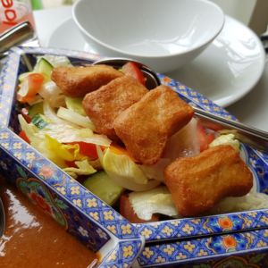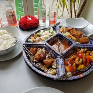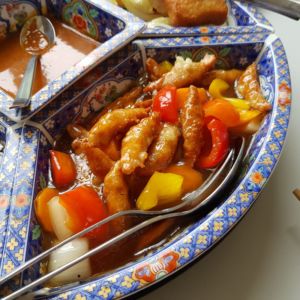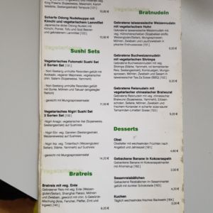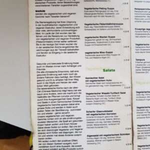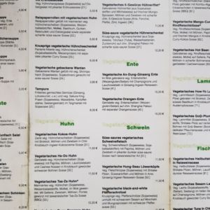 Wir besuchten das Restaurant an einem Freitag Mittag gegen 15 Uhr und bekamen einen Platz an einem der Tische drinnen. Wir bestellten Rhabarbersaftschorle und studierten das große Menü. Wir ließen uns von einem Nachbartisch inspirieren und bestellten eine gemischte Platte aus drei verschiedenen Speisen: Vegetarisches Erdnuss-Huhn auf Salat, vegetarisches Kokos-Huhn mit Brokkoli und Möhren, süß-saures vegetarisches Schweinefleisch mit Paprika und Möhren und die vegetarische An-Dung-Ginseng Ente mit Champignons in Ginseng-Ingwer-Reissweinsoße.